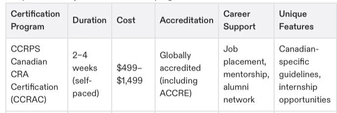 To determine which program suits your goals and experience, here’s a quick comparison of major CRA certification programs:
