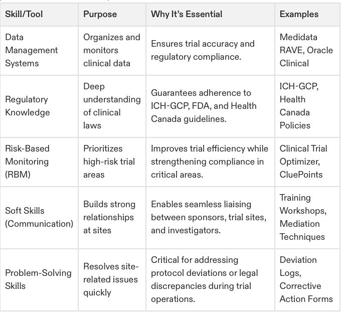 This table provides a detailed comparison of the key skills and tools CRAs need to perform their role effectively.