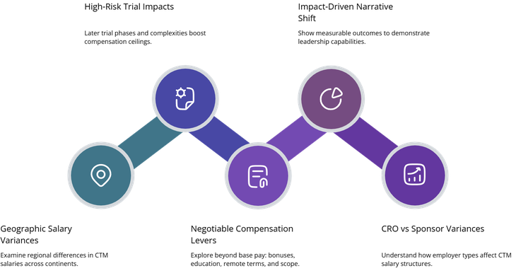 Employer type: Sponsor roles often pay higher base, while CRO roles can offer faster promotion velocity. Vendor heavy environments reward CTMs who can manage governance without chaos.
