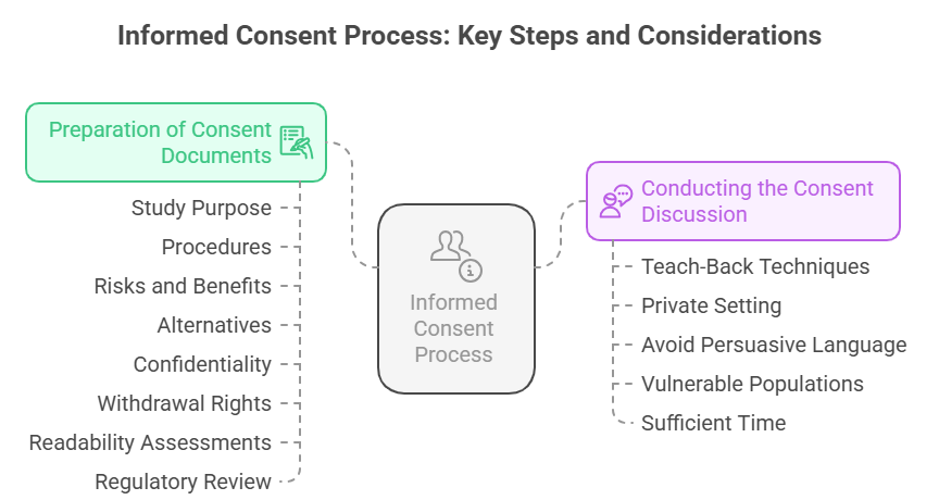 Informed consent begins with the development of clear, concise, and participant-friendly documents. Consent forms must explain the study’s purpose, procedures, potential risks and benefits, alternatives, confidentiality, and the right to withdraw. These forms should use simple language, avoiding technical jargon, and must be culturally and linguistically appropriate. To prepare effective consent documents, researchers should conduct readability assessments, consult community representatives if the study involves diverse populations, and pretest the forms for comprehension.