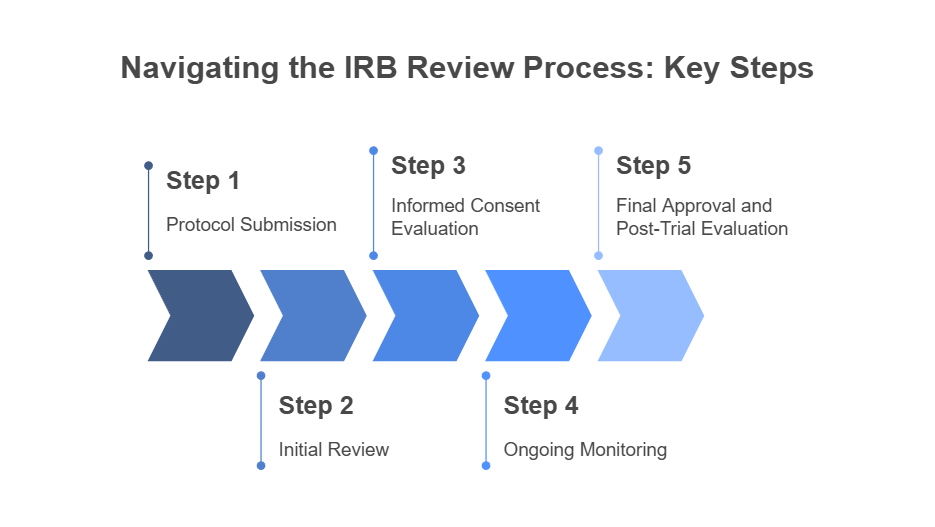 The Institutional Review Board (IRB) review process is designed to ensure that clinical research studies are ethically sound and protect the rights and welfare of participants. The process involves several key steps: