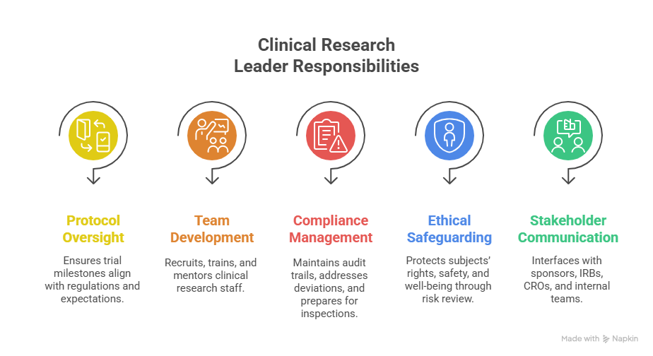 A Principal Investigator (PI) is legally accountable for trial integrity, but the best clinical research leaders go far beyond minimal compliance. They translate protocols into action, rally multi-disciplinary staff under one goal, and uphold ethics even when under pressure from sponsors or CROs. Every PI must internalize and execute five core categories of responsibility.