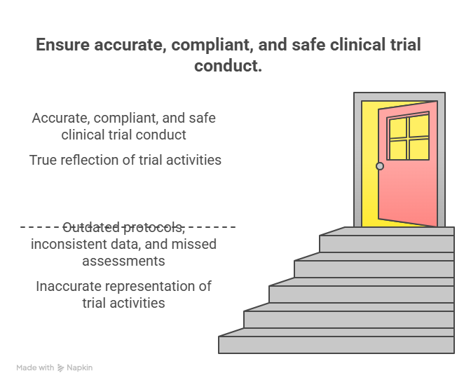 | Regulatory files | Essential document currency | Only checking presence, not currency | Verify completeness, signatures, dates, validity | Managing regulatory documents for CRCs |