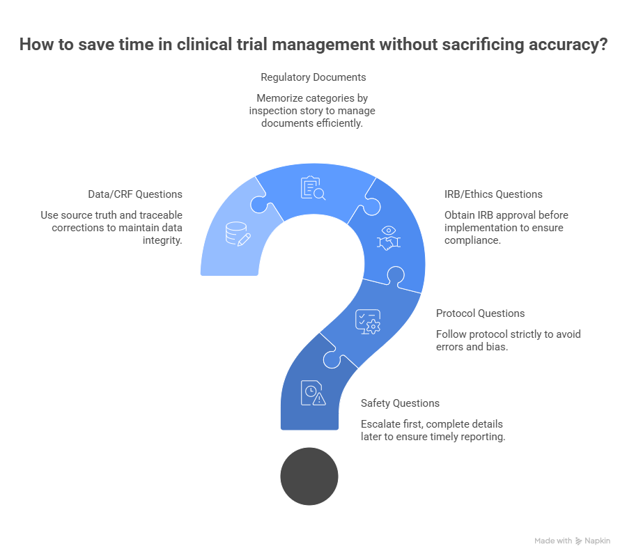 Pass 1: Answer anything you can solve confidently in ~45–60 seconds. If it’s not resolving, flag it and move. This mirrors how CRCs triage tasks in real sites: act on what you can execute safely, escalate what needs more information—exactly the mindset in protocol management responsibilities and regulatory documents management for CRCs.