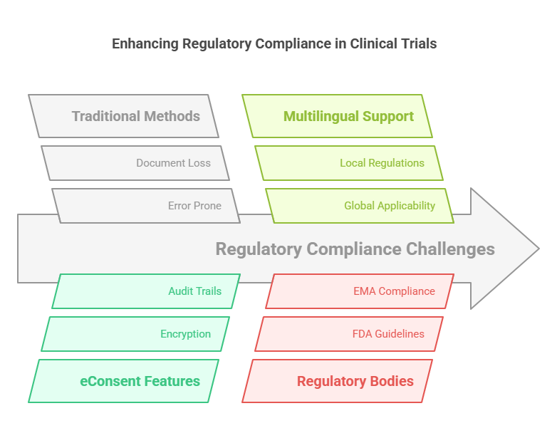 Clinical trials: Compliance with regulatory requirements is essential, particularly with respect to informed consent. The failure to comply with the guidelines put in place by regulatory bodies like the Food and Drug Administration (FDA) in the United States or the European Medicances Agency (EMA) can attract penalties, which may include fines or even the ending of a clinical trial. Traditional paper-based consent forms are also associated with compliance problems due to the possibilities of error, lost documents, or missing information.