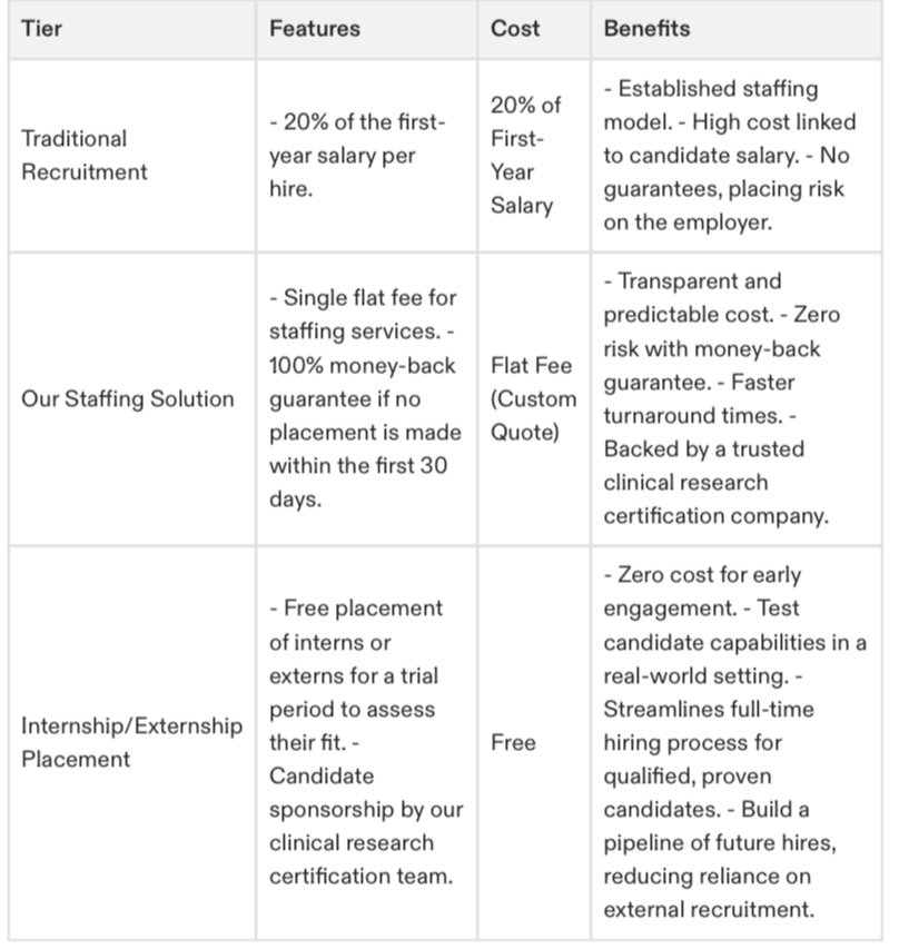By shifting away from traditional hiring models, CROs can dramatically reduce their staffing expenses. Here's a side-by-side comparison of CCRPS vs. traditional staffing agencies: